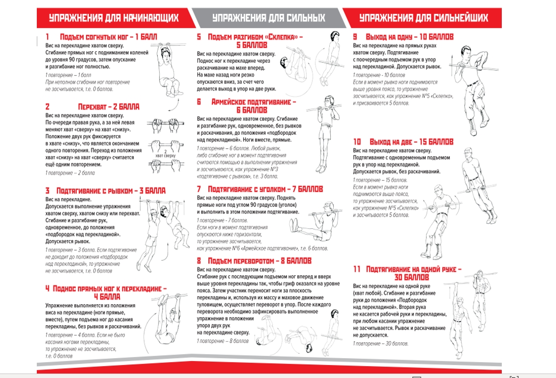 Мальчики выбирают упражнения из полного перечня системы проведения «Русский силомер» (с 1 по 11-е), девочки из сокращенного перечня (с 1 по 4 е).